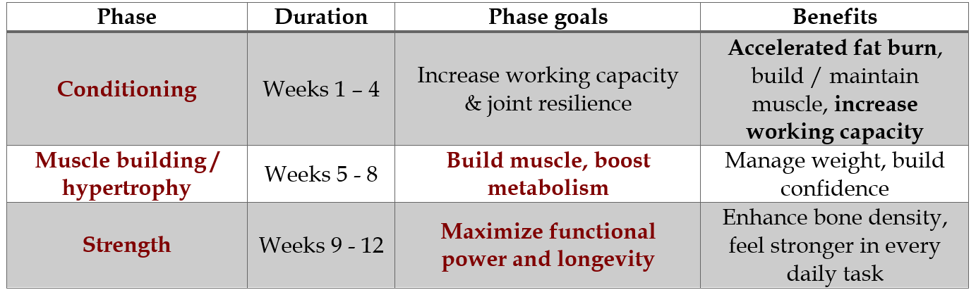 Instead of random workouts that lead to plateaus and burnout, The Fit4Success Blueprint uses scientific Periodization - a phased approach (Conditioning ►Muscle building / hypertrophy ► strength) that guarantees results and resilience: