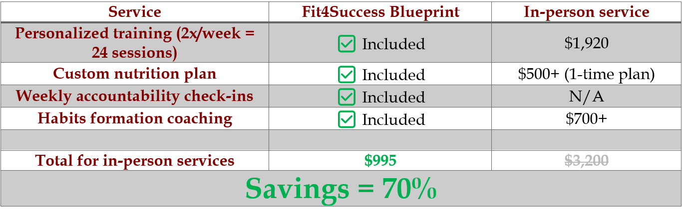 The Fit4Success Blueprint delivers everything you’d get from a certified personal trainer, a nutritionist, and a lifestyle coach—at about ¼ of the cost. It’s personalized, flexible, and built for busy professionals. You have all this and your coach in your pocket 24/7.